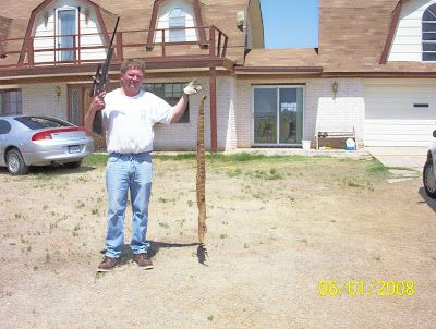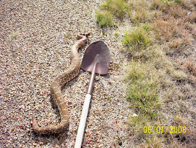 Hmmmm!! This snake was killed out off the pavement about 300 yards southeast of my house at 10 am Sunday morning, 6-1-08.. He or she was 6 foot long (with the head (as big as your hand) and neck before we cut it off and threw it out in the pasture), measured 4 inches wide at it’s widest point, and was heavy, don’t even want to guess the weight. The snake striked the shovel and knocked it out of my neighbor’s hand while he was trying to hit it in the head. He has more guts than I do! My neighbor told me he killed one last summer that was 7 feet long. This snake gave me the heeebeee jeeebeees!! Seems we have some big ones out here, I killed one last year that was right under 5 feet long.