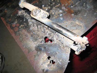 I changed the oil in quadzilla tonight and had a little time, so I decided to do a little practicing. All I had laying around was some sheet metal. I tried to lay some beads and I promptly burned holes. Next I tried attaching a bolt to the sheet metal. Then I welded a few bolts together. It doesn’t look pretty, proof that I need lots of practice. I’m using flux core wire right now… which seems to be very messy. I’m going to try to buy a CO2/Argon bottle and some solid wire this weekend.