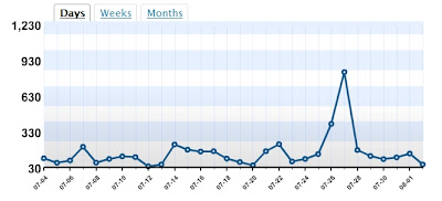 My website usually has around 100 viewers per day. It is interesting to see the influence of having a link on a big name website. (830 visits on 7/27/08)