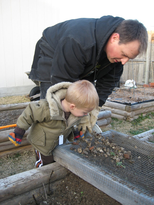 Bryson helped me in the garden this afternoon. We screened more dirt to get the raised bed number 5 ready for planting. We founds lots of “Worrrrmz” and even some “Babeee Worrrrmz”.