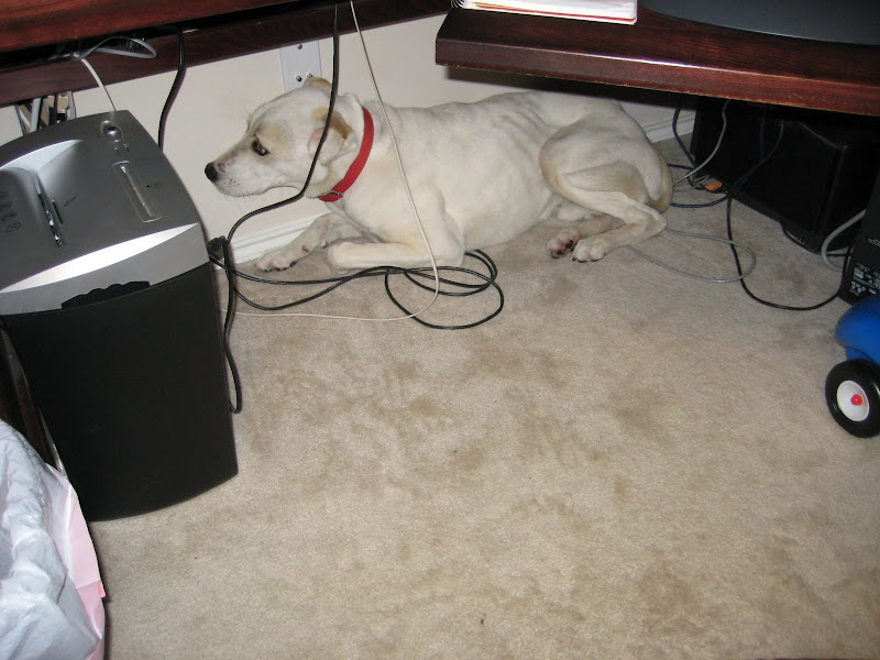 A thunderstorm blew over us tonight. Dasher freaks out during storms. He tries to get under whatever he can fit and hide.