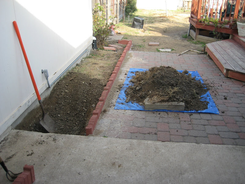 Digging down about 12″, removing construction debris and unused irrigation sprinkler and pipe as I go. I thought using the tarp would keep mud off the patio, not sure that worked out as good as planned.