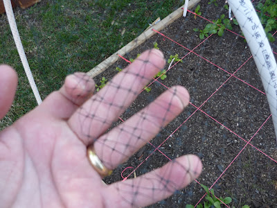 - I tried 1" x 1/4" lathe for the square foot dividers. They took up too much room due to their width, bowed everytime I watered, would likely serve as a hard rub point for the plants, and were really a pain in the arse to work soil under. The mason's twine works well for laying things out, and Maggie the Dog thinks that they're flashy trip wires (if you know what I mean). If the string gets in the way once the plants push their borders, my pocketknife will resolve the problem quickly. They're tied to 6p finish nails driven about 1 inch into the boards. I can bust it all lose and restring at will.