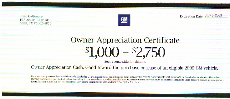 I’ve made 4 car ownership decisions in my life, and I’ve always made the choice to buy a Chevrolet. I’ve always liked the style, ride, comfort, power, accessory availability, etc. Today we received a letter in the mail from GM saying thanks for being a customer, we are still here, ready for business, better than ever because we are backed by the government, don’t let our bankruptcy worry you because we are marketing it as “reinvention” and we really think you should buy a new vehicle from us. Then at the bottom of the letter was this coupon: