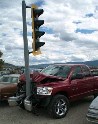 Now here’s a hard core drinker and one tough Dodge truck.The driver hit the left turn light at 27th St. and sheared off the light post at the base, and then kept driving on about 2 miles to Squires Four Pub, where he stopped for more beer!! How impaired do you have to be to NOT notice that you are carrying a stop light? ( I Wonder if the light was green? )