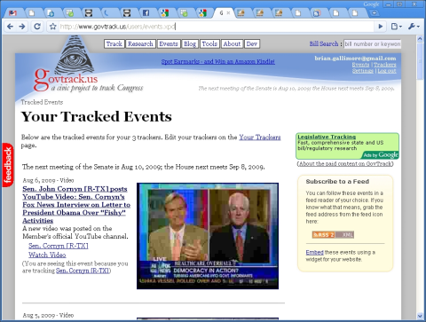 I just ran across a very nifty tool tonight. It comes from the govtrack.us website, which is dedicated to letting you figure out what is going on in Congress. Click on the “Track” button, and specify what all you want to keep track of. I just put in my two senators and my representative. Next, it creates a custom news feed (RSS) for you to add to your newsreader. If you still don’t use a newsreader, don’t worry, it creates a custom web page for you too.